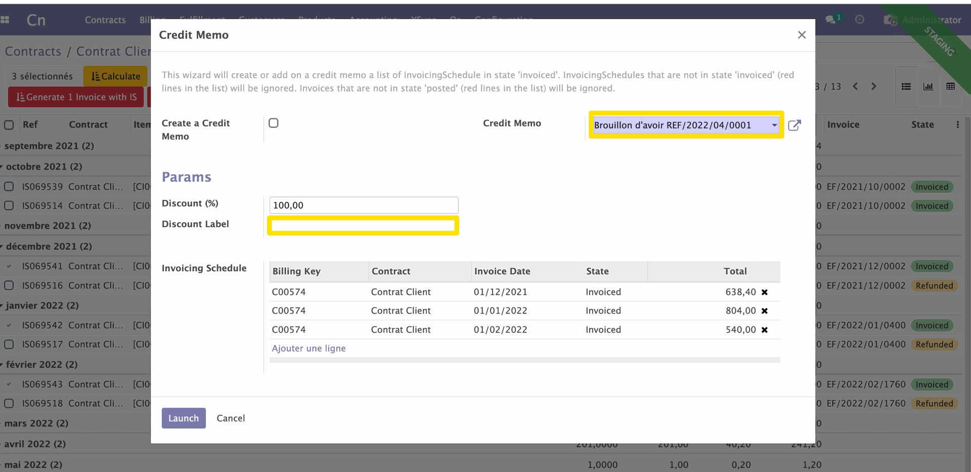 L'interface de gestion de l'avoir vous permet de générer le discount de 100% pour les lignes d'abonnement fixe que vous ajoutez à un avoir déjà créé pour les 10% de la ligne variable
