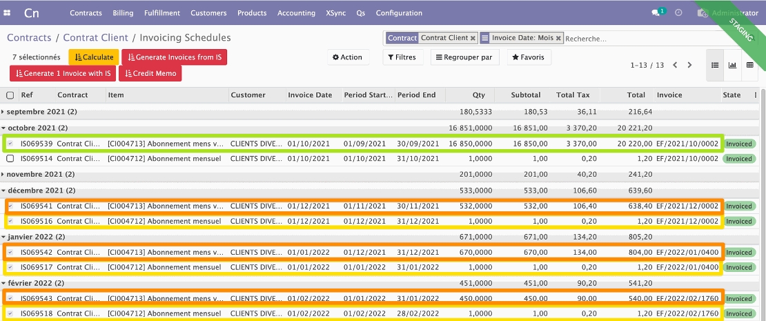 Cn285 regroupera les 2 lignes d'IS (du même contrat et du même contract item) sur la même ligne d'avoir comme on peut le voir ci-dessous dans notre exemple : Abonnement à prix fixe du Contrat test 2.